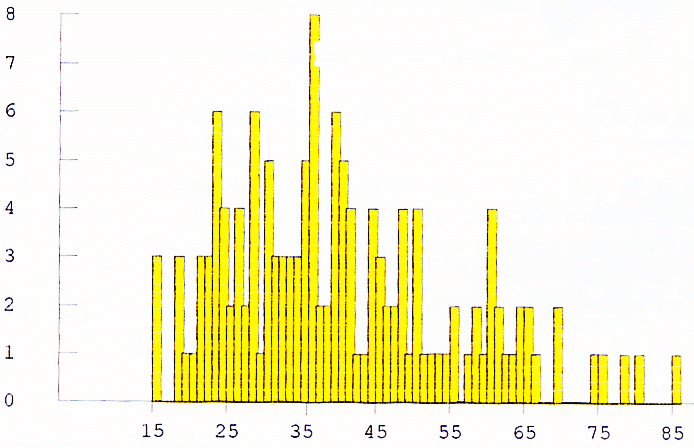 Une description de la série numérique s'appuyant sur le diagramme construit peut être : On observe une relative concentration des textes les plus courts opposée à une toute aussi relative dispersion des textes les plus longs. On observe également une nette asymétrie de la distribution vers les valeurs les plus basses. Enfin la courbe formée par les extrémités, des bâtons du diagramme est tout d'abord croissante jusqu'à la valeur 36 d'effectif 8 puis décroissante. La croissance est relativement forte la décroissance au contraire plutôt douce.